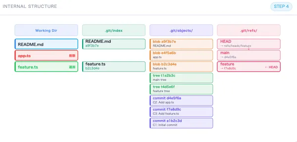 bloba9f3b7eREADME.mdmain から参照ありblobe4f5a6bapp.tsどこからも参照なし(孤立)treet4e5f6aroot treecommit d4e5f6a から参照commitd4e5f6aAdd app.tsブランチ参照なし(孤立)commitc1a2b3cInitial commitmain から参照あり注意: --hard で消えた Working Directory の変更(コミットされていない編集内容)は .git/objects/ にも存在しないため、復元できません。復元できるのは、過去にコミットされたことがあるデータだけです。